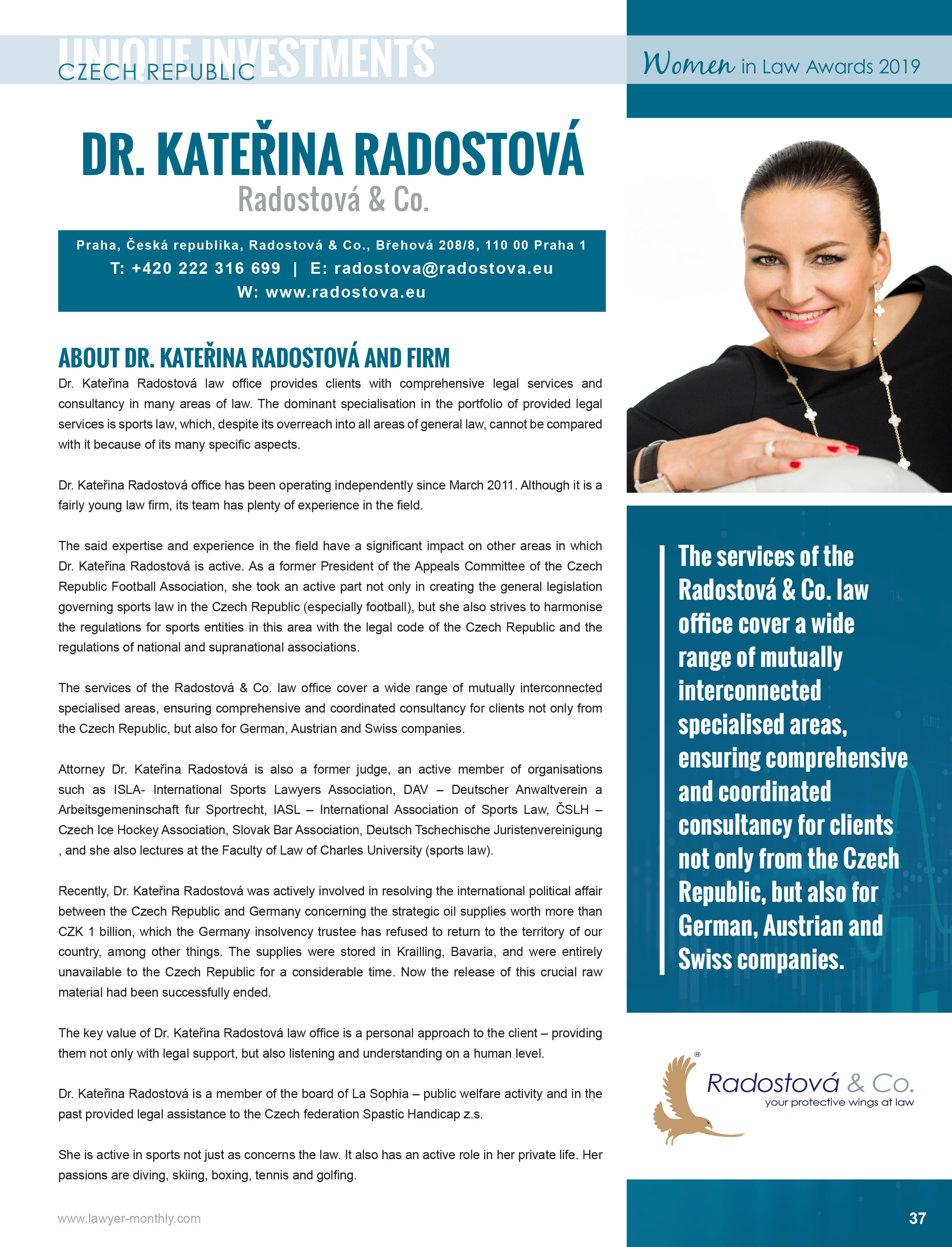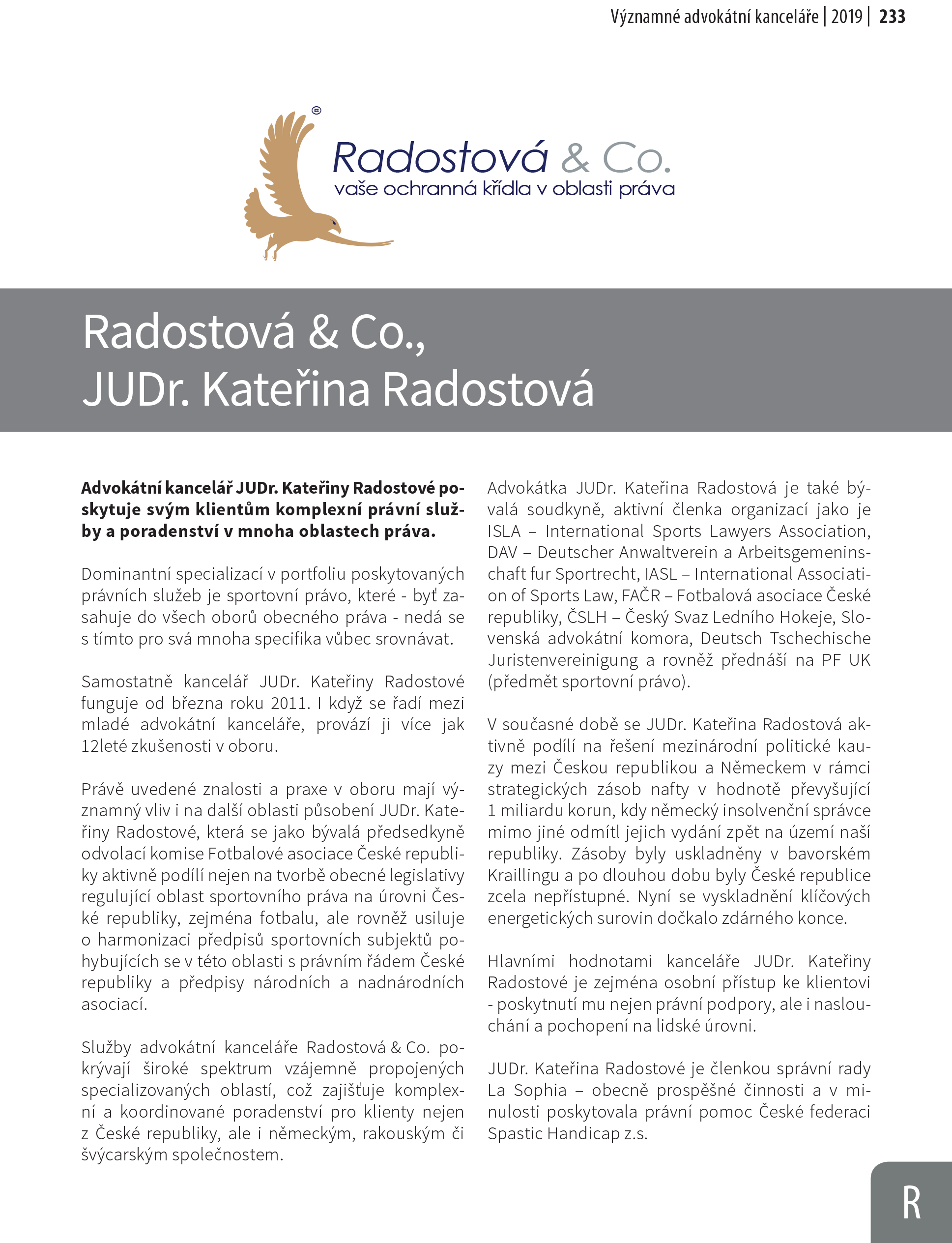 Jako každý rok, i tento, se vyhlašovali v rámci "PRÁVNICKÉ FIRMY ROKU" kategorie advokátních kanceláří a jejich renomé. Máme velkou radost, že naše advokátní kancelář, Radostová & Co. se umístila mezi nejvíce doporučovanými kancelářemi se specializací na sportovní právo. Celé výsledky ZDE.